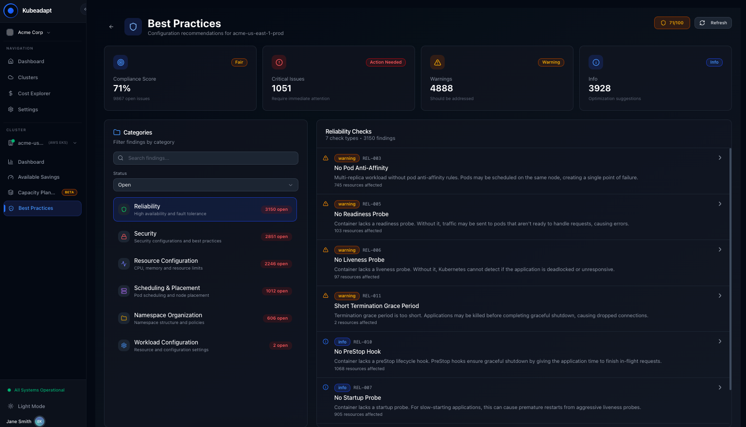 Best Practices scans your cluster for configuration issues and reports findings with severity levels and remediation guidance. A compliance score tracks your overall configuration quality.