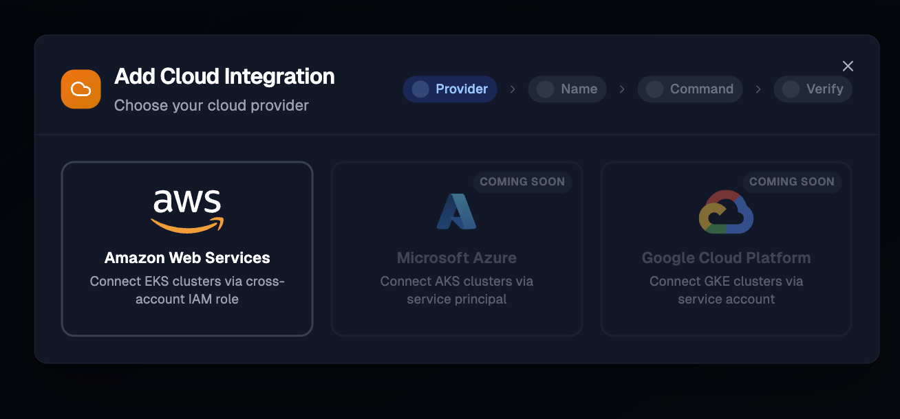 Click Add Cloud Integration to start the setup wizard. For AWS, the wizard generates a bash script that creates a cross-account IAM role with read-only access. See the AWS Integration guide for the full walkthrough.