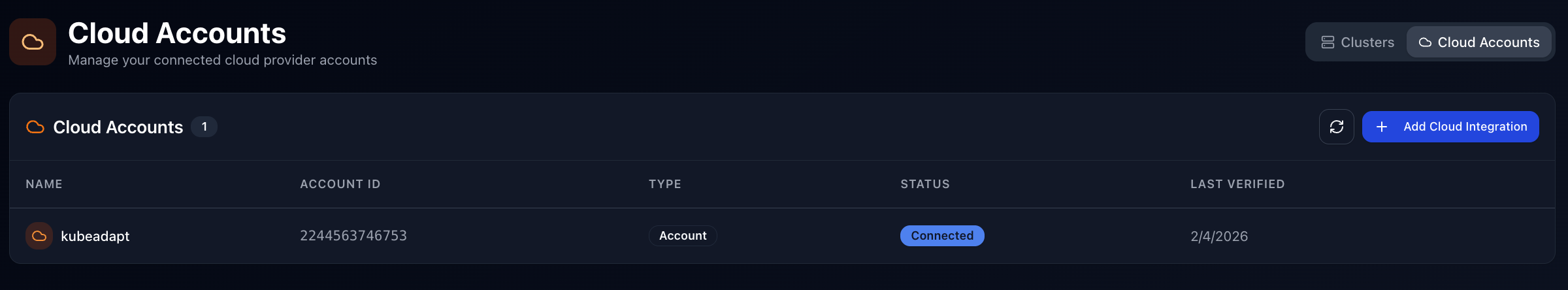 View and manage Kubernetes clusters and cloud account integrations. Connect AWS accounts for RI/SP cost attribution and EKS auto-discovery.
