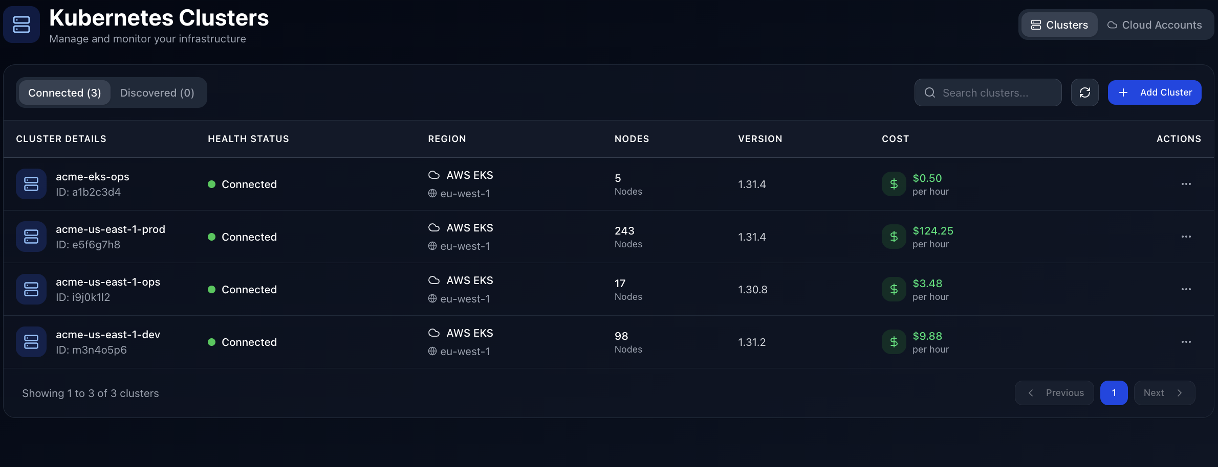 The Clusters tab lists every Kubernetes cluster connected to your organization. Each row shows connection status, region, node count, and hourly cost.