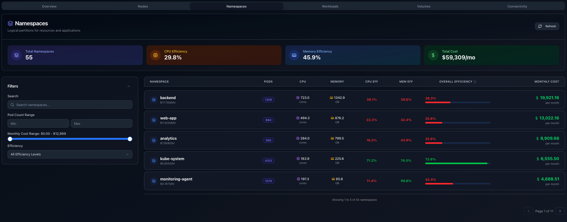 Drill into namespace-level cost breakdowns, workload counts, and resource efficiency.